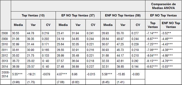 2008-2014, a este grupo de empresas las consideramos exitosas y las denominamos Top Ventas. Las empresas restantes se clasifican en ENF NO Top Ventas y EF NO Top Ventas. Para identificar si existen diferencias significativas entre los tres grupos definidos se aplica un ANOVA.