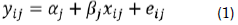 Donde es el valor de la variable respuesta (RevPAR) de cada hotel (i) y para cada nivel de agregación (j) (País, Zona o Ciudad); es el valor de la intercepta en el origen de coordenadas para cada nivel de agregación; es el valor particular de la pendiente de la recta para cada uno de los niveles de agrupación; es el valor de las variables explicativas; y es el error para cada hotel en cada nivel de agregación. En conjunto, se asume que su distribución sigue una distribución común normal con media cero y desviación típica (Bates, Mächler, Bolker, & Walker, 2014; Seoane, 2014).