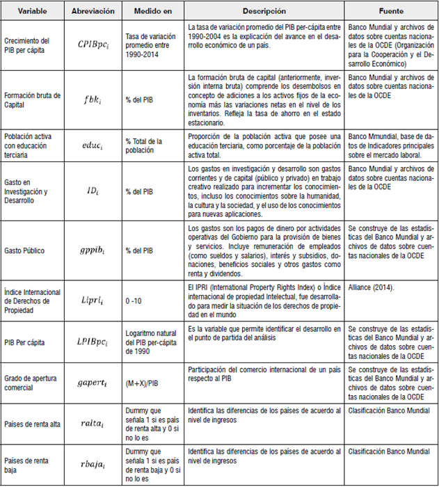 Para el ejercicio econométrico se tomaron los promedios de los datos del Crecimiento del PIB per cápita (CPIBpci ), teniendo en cuenta el criterio del Banco Mundial para definir a los países de renta alta, media y baja. Las variables explicativas son: la formación bruta de capital respecto al PIB fbki , la cantidad de personas con educación terciaria en cada país como proporción de la población total (educi ), el gasto en I+D respecto al PIB (IDi ), el logaritmo natural del índice IPRI como proxy del esfuerzo de protección con DPI (Liprii ), el logaritmo natural del PIB per cápita de 1990 LPIBpci ), que permite establecer la existencia de convergencia entre países. Finalmente, como variables control se toman: el gasto público respecto al PIB (gppibi ), el grado de apertura económica (gaperti ) y las dummys que identifican los países según su renta.