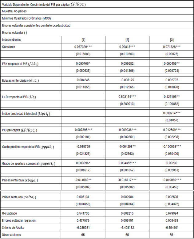 Las regresiones evidencian que, estadísticamente, el efecto de la inversión en capital físico es altamente significativo cuando se adiciona LIPRI, demostrando que en los países existe una complementariedad entre acumular capital físico y fortalecer la definición de los derechos de propiedad intelectual. Esto no significa que se esté mostrando una causalidad entre las dos variables, sino que son dos condiciones importantes para que los países avancen en su desarrollo económico.