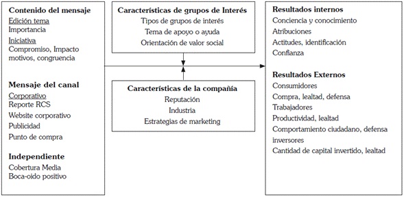 En la figura 1, Du, Bhattacharya y Sen (2010) proponen un marco comunicacional para la efectiva comunicación de la RSC, en el que incluye las características por tener en cuenta en los contenidos de los mensajes, los canales de comunicación, los factores contingenciales moderadores relacionados con las características de los stakeholders, las fortalezas de la compañía o la industria y los resultados internos dirigidos a los colaboradores de la empresa.