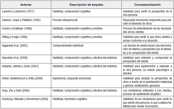 La adopción de perspectiva ha sido conceptualizada desde el marketing y las ventas en diversos trabajos como empatía cognitiva con un mínimo componente emotivo. Autores como Aggarwal et al. (2005), Dawson et al. (1999), Lamont y Ludnstrom (1997), entre otros, son algunos de ellos. En la tabla 1, se resalta en orden cronológico la definición de empatía desde una visión cognitiva acompañada de una visión emotiva, referida como el entendimiento intelectual del estado interno de otra persona (Hogan, 1969), que se anticipa en las reacciones de la otra y que percibe sus necesidades, motivaciones u opiniones en interacciones de ventas y prestación del servicio (Devoldre, Davis, Verhofstadt y Buysse, 2010).