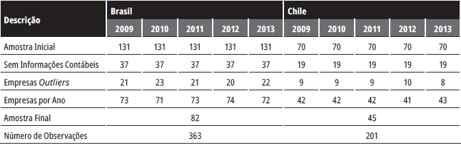 Como pode-se observar no Quadro 1, a amostra inicial foi composta por 131 empresas brasileiras e 70 empresas chilenas. Foram excluídas as empresas que não apresentaram informações contábeis suficientes para a composição das variáveis utilizadas no estudo, além das empresas outliers. Para a identificação das empresas outliers, aplicou-se o Teste KS (Teste de Kolmogorov-Smirnov) para verificar a distribuição das variáveis da amostra separadamente para cada país, com o intuito de comparar a distribuição de frequência das variáveis observados da amostra e identificar se os dados possuem uma distribuição normal. As variáveis que apresentaram distribuição normal, aplicou-se o método 6σ a fim de identificar os outliers acima e abaixo de três desvios padrões, e para as variáveis que não apresentaram normalidade aplicou-se o método Box-Plot. Dessa forma, a amostra da pesquisa compreendeu 82 empresas brasileiras (totalizando 363 observações) e 45 empresas chilenas (com 201 observações).