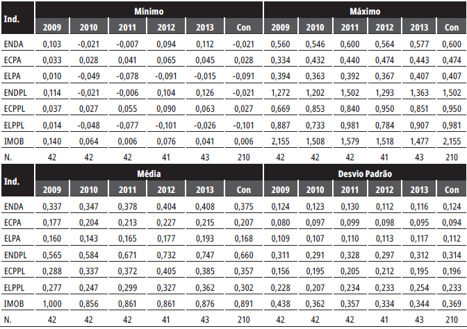 Conforme os procedimentos descritos na metodologia, realizou-se inicialmente a análise dos indicadores de endividamento e da imobilização dos ativos com o intuito de identificar a composição da Estrutura de Capital das empresas industriais brasileiras pertencentes à amostra. Os indicadores foram segregados por ano assim como para o período acumulado (Cons.) de 2009 a 2013, como pode-se observar na Tabela 1.