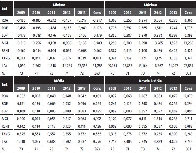 Sendo assim, quanto maior forem o Endividamento de Curto Prazo sobre o Ativo (ECPA), Endividamento de Longo Prazo sobre o Ativo (ELPA) e o Endividamento Total sobre o Património Líquido (ENDPL), maiores serão o Retorno sobre o Ativo (ROA), Retorno sobre o Património Líquido (ROE), Lucro Operacional sobre o Ativo (LOP), Margem Líquida (MGL) e o Lucro por Ação (LPA) e menores serão a Rentabilidade (RENT) e a Tangibilidade (TANG).