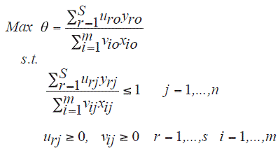 (1)Donde uro y vro es el conjunto de los pesos más favorables para la DMU0 en el sentido de maximizar la razón anterior.