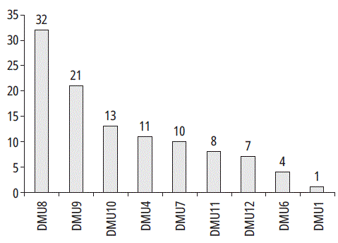 La figura 1 muestra las veces que cada empresa eficiente evalúa a las empresas ineficientes. Al realizar un análisis del conjunto de referencia, este nos indica que la DMU8 es la empresa del sector que más sirve como referente de comparación a las empresas ineficientes, con una frecuencia de 32 veces. Este resultado es coherente con la información de la tabla 4; por esta razón, DMU8 podría ser considerada como la empresa líder del sector.