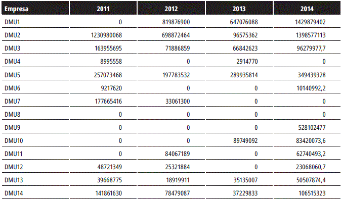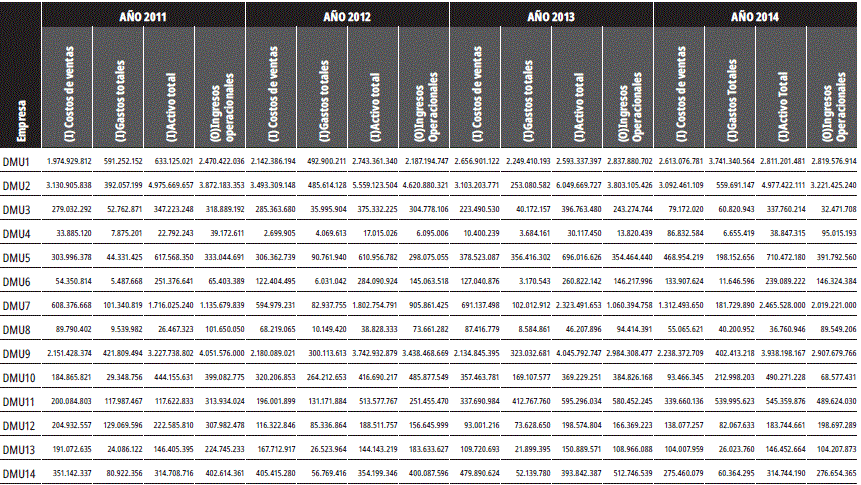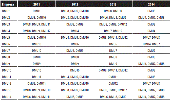 Los resultados del análisis de eficiencia muestran que los niveles logrados por las empresas son altos para los cuatro años; sin embargo, es importante resaltar que las DMU4, DMU6, DMU7, DMU8, DMU9, DMU11 Y DMU12 presentaron una eficiencia media por encima del promedio, mientras que las DMU3 y DMU5 muestran un desempeño bastante discreto. Para 2014 las DMU3 y DMU10 evidencian un deterioro de su eficiencia, que se podría relacionar con la disminución drástica de la actividad operacional de las empresas durante este año.
