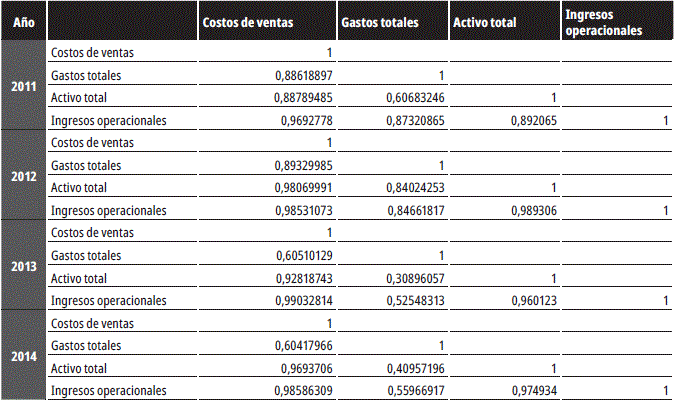 La tabla 3 muestra los coeficientes de la matriz de correlación de las observaciones de cada variable de interés de la investigación. En los datos se percibe que existe alta correlación positiva entre las variables de entrada y la variable de salida; lo anterior sugiere que un incremento en los valores de entrada mostrará un aumento en los valores de salida. Este comportamiento es lo que se podría esperar, teniendo en cuenta que la inversión y los gastos en una empresa deberían representar un mayor nivel de ingresos.
