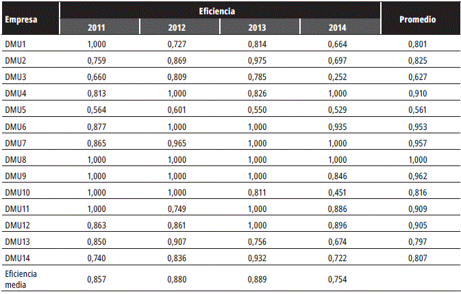 Los índices de eficiencia obtenidos para cada unidad evaluada se presentan en la tabla 4, que muestra, a partir del modelo DEA CCR-O, la eficiencia por año y promedio durante el periodo 2011-2014 de cada una de las empresas del sector carbón en Colombia, así como también la eficiencia promedio del sector para cada año. Siendo calificadas como eficientes 19 observaciones, en promedio una de cada tres empresas se ubica en la frontera eficiente por año. La DMU 8 es eficiente durante todo el periodo de estudio. Una DMU es eficiente si el puntaje de eficiencia es igual a 1. La eficiencia promedio de las empresas en el periodo de estudio es del 84,5 %, lo que indica que con los mismos insumos sus ingresos operacionales potencialmente podrían ser 18,3 % mayores.