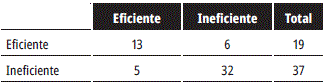 La variable de agrupación son los datos de la tabla 4 de donde obtenemos "eficiente" (19 observaciones) e "ineficiente" (37 observaciones). Las variables independientes son los datos de la tabla 1. Con esta información se procedió a la aplicación del análisis discriminante con el software SPSS20; los resultados se muestran en la tabla 7.