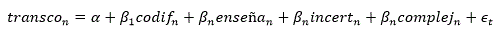 (1)En la ecuación, transcon representa el puntaje promedio de la variable "transferencia del conocimiento" establecido por el n-ésimo individuo consultado; codifn es el atributo codificación del conocimiento; enseñan, el atributo enseñanza del conocimiento; incertn, el atributo incertidumbre del conocimiento; complejn es el atributo complejidad del conocimiento; α es la constante de la regresión; β1, β2, β3 y β4 son los valores de los efectos marginales asociados a los niveles de cada atributo, y εt es el error de estimación. Para medir el grado de ajuste del modelo se utilizó el coeficiente de determinación, R2, además de las pruebas de significancia individual t-student y prueba de inferencia global F-Fisher.
