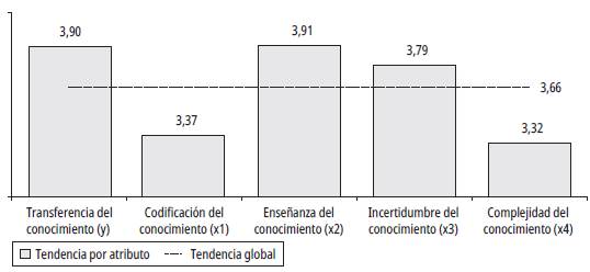 Para complementar el análisis descriptivo unidimensional de la tabla 3 y poder evidenciar la tendencia de las respuestas, se computó un valor referencial medio para la totalidad de las variables independientes revisadas (tendencia global de 3,6), y se obtuvo la enseñanza del conocimiento (3,91) y la complejidad del conocimiento (3,32), las valoraciones más alta y más bajas, respectivamente. La figura 2 resume las valoraciones medias generales obtenidas para las variables independientes del estudio, con respecto a la tendencia general de las dimensiones.