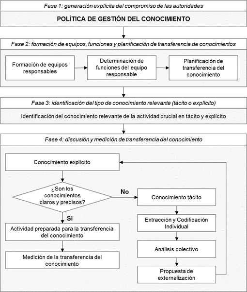 Fase de discusión y medición de transferencia del conocimiento: consiste en analizar el tipo de conocimientos identificados, por medio de dos etapas. La primera es que, si los conocimientos se identifican claramente como explícitos, antes de transferirlos hay que revisar si son claros y precisos; si es así se procede a autorizar su transferencia, pero si no lo son pasan a ser tratados como tácitos, es decir, se deben descodificar y volver a codificar. La segunda parte es el tratamiento de conocimientos tácitos, este conocimiento primero debe pasar por una extracción individual (el individuo que posee el conocimiento se hace responsable de su codificación); posteriormente, se realiza la codificación colectiva propuesta para comparar y realizar el análisis colectivo de los grupos involucrados en relación con dicho conocimiento. Una vez discutido el tema se hace la propuesta de externalización para transformarlo en un conocimiento explícito a la espera de la autorización de transferencia. Por último, la medición consiste en evaluar la transferencia del conocimiento según indicadores previamente establecidos y que deben estar conectados al uso de herramientas tecnológicas por cada empresa.