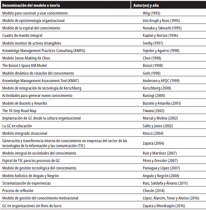 Hoy por hoy, el conocimiento es considerado un recurso estratégico clave dentro de las organizaciones y una fuente de ventaja competitiva, que permite alcanzar rendimientos superiores al promedio de la industria (Benavides, 2011; López et al., 2014). La existencia de diversas teorías y modelos relacionados con la GC muestra, por una parte, la relevancia y el interés por el tema y, por otra, la amplitud ideológica existente sobre este, lo que permite un amplio espectro de discusión. A continuación, en la tabla 1, se resumen algunos de estos modelos y teorías.
