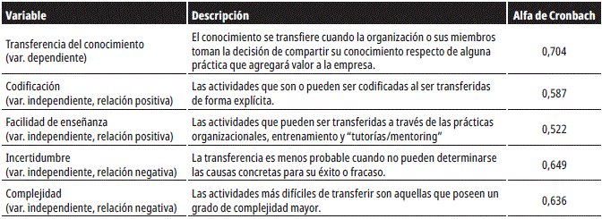 La primera parte contiene preguntas de caracterización, tanto de la empresa (nombre, rubro y fecha de constitución) como del ejecutivo a cargo (nombre, edad, puesto de trabajo, nivel de estudios y la antigüedad en la empresa). La segunda sección recoge datos sobre "los atributos del conocimiento" (codificación del conocimiento, enseñanza del conocimiento, certidumbre del conocimiento y complejidad del conocimiento) y fue medida a través de 12 preguntas en una escala Likert de 5 puntos (1=completamente en desacuerdo a 5=completa-mente de acuerdo). La tercera parte agrupa 7 preguntas, también medidas con una escala Likert del mismo puntaje, respecto de la transferencia del conocimiento. La operacionalización y fiabilidad de las variables mencionadas se detallan en la tabla 2.