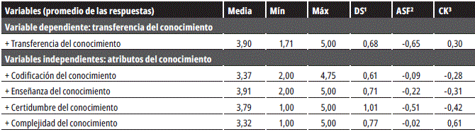 Para la medición de la fiabilidad del instrumento se utilizó el coeficiente Alfa de Cronbach y para la exploración y el análisis de los datos se usó la estadística descriptiva, mediante la construcción de tablas de frecuencia y del cómputo de medidas de tendencia central, dispersión, correlación y forma. Asimismo, se realizó un análisis de regresión lineal multivariado entre la transferencia del conocimiento y las variables independientes de los atributos del conocimiento (codificación, enseñanza, certidumbre y complejidad del conocimiento), a fin de estimar su efecto marginal en la transferencia por medio del método de los mínimos cuadrados ordinarios (MCO).