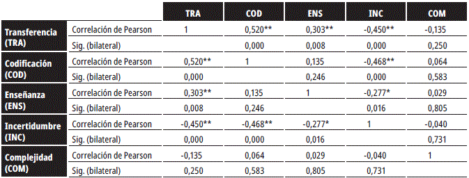 La tabla 4 resume el examen de las correlaciones parciales entre las variables de estudio. Se observó una asociación positiva y significativa (p<0,01) entre la transferencia del conocimiento y las variables: codificación del conocimiento (p=0,000) y enseñanza del conocimiento (p=0,008), mientras que la incertidumbre del conocimiento y la complejidad mostraron asociaciones negativas, pero solo la primera fue significativa al 1 % (p=0,000). Dichos resultados concuerdan con las relaciones esperadas que se indicaron en la tabla 2.