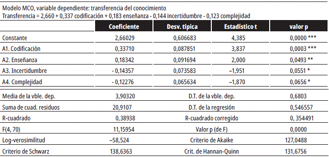 Finalmente, la tabla 5 muestra el análisis de regresión multivariado, entre la transferencia del conocimiento y los atributos del conocimiento. En ella se observa que la codificación del conocimiento (β=0,337, t=3,837) y la enseñanza del conocimiento (β=0,183, t=2,000) son relevantes al nivel de significancia del 5 %, mientras que la incertidumbre del conocimiento (β=-0,144, t=-1,951) y la complejidad del conocimiento (β=-0,123, t=-1,870) resultaron ser relevante al 7 %. El modelo en conjunto mostró ser significativo al 99 % de confianza (p=0,000), con una bondad de ajuste del modelo del 38,9% (R2), una distribución normal de los residuos (p= 0,56126); además, fue concordante con las relaciones que ya mostraban asociación significativa en el análisis de correlaciones bivariadas preliminares (véase la tabla 4).