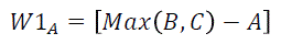 (3)En la ecuación (2), A, B y C denotan las cuotas esperadas de votación de cada partido y Max(B,C) representa el máximo de votación entre B y C (el partido líder). Cuanto mayor sea el valor de (2), más probable será que un voto a favor de A se pierda y, en consecuencia, menos probable que un elector efectué tal sufragio. La ecuación (3) representa el impacto de la competitividad entre B y C sobre el costo de oportunidad de votar por A; en otras palabras, el costo de oportunidad de votar por A se incrementara en la medida que la competitividad entre los demás partidos aumente y A no presente oportunidades de ganar la elección. Esta última condición implica que (3) debería ingresar al modelo multiplicado por (2).