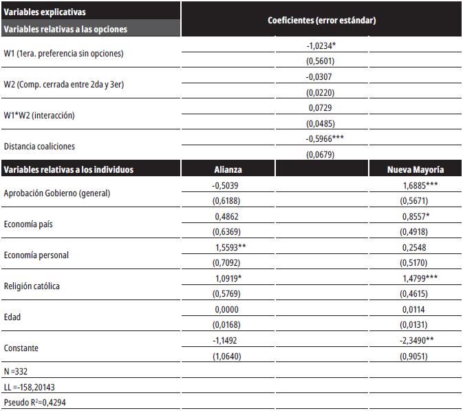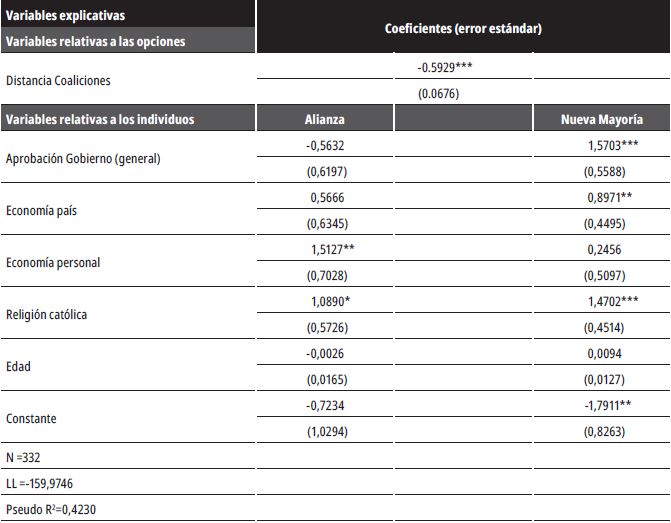 Respecto de las variables independientes, se incluyeron cinco variables sociodemográficas4 de los individuos como edad (años), nivel educacional (años de escolaridad), evaluación de la economía personal (dummy igual a 1 si la economía personal a mejorado), religión (dummy igual a 1 si es católica y 0 en otro caso) y urbano (dummy igual a 1 si el individuo reside en zona urbana); una variable de evaluación retrospectiva del Gobierno (dummy igual a 1 si el individuo aprueba la gestión presidencial); dos características de los partidos relativas a los electores: distancia del elector respecto a las coaliciones en el espacio izquierda-derecha y papel del Gobierno en la economía. La distancia ideológica entre votantes y coaliciones se calculó como el valor absoluto de la distancia entre la posición política autorreportada de los electores en la Encuesta julio 2014 del Centro de Estudios Públicos de Chile (CEP) y la posición de los partidos políticos según encuesta a diputados chilenos (2010-2014) del Observatorio de Élites Parlamentarias en América Latina de la Universidad de Salamanca (Viñuela y Artés, 2009; Poiré, 2000). Se espera que la distancia frente a las coaliciones genere un impacto negativo en la utilidad de estas y, por tanto, una menor probabilidad de voto. Finalmente, las variables asociadas al costo de oportunidad del voto sincero fueron incluidas como características de las alternativas y se estimó un solo parámetro común para las tres coaliciones (Álvarez y Nagler, 2000).