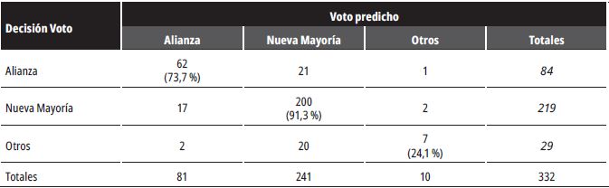 La tabla 5 también revela cómo se distribuyó el voto estratégico entre las tres coaliciones políticas. Como se aprecia, la Alianza y Otros partidos políticos se vieron levemente beneficiados a costa de la Nueva Mayoría. Según las estimaciones sinceras, la Nueva Mayoría debería haber obtenido un 73,8 % de la cuota de votos; sin embargo, con votación estratégica este porcentaje fue estimado en un 72,6 % del electorado. Dentro de quienes desertaron estratégicamente de la Nueva Mayoría, se puede entrever que un 62,5 % votó por la Alianza y 37,5 % por la coalición Otros. En el interior de la Alianza, el 100 % de quienes desertaron decidió votar por candidatos de la Nueva Mayoría. La coalición Otros, en términos proporcionales, resultó ser la gran ganadora de la votación estratégica, pues experimentó un crecimiento del 42,9 % en su masa de votantes, fracción que se atribuye a la transferencia de sufragios que recibió desde la Nueva Mayoría. Este último resultado llama poderosamente la atención, ya que se debe considerar que dentro de la coalición Otros se incluyó al Partido Comunista de Chile, que en términos prácticos es más cercano ideológicamente a la Nueva Mayoría, la coalición de centro izquierda en Chile (Instituto de Iberoamérica, 2010), factor que explicaría dicha migración de votos. El impacto de la votación estratégica podría explicar también el resultado positivo del Partido Comunista en las elecciones de diputados de 2013, instancia donde vio duplicada su representación en la Cámara Baja (desde 3 hasta 6 diputados electos). Además, es relevante notar que Otros no presentó fuga de votantes por consideraciones estratégicas, lo que se condice con la intuición que los electores del Partido Comunista se encuentran distantes por cuestiones históricas de las demás coaliciones y en particular de la Alianza; por tanto, se puede inferir que se trata de un grupo de votantes duros o fieles.
