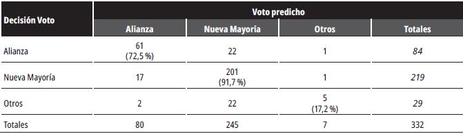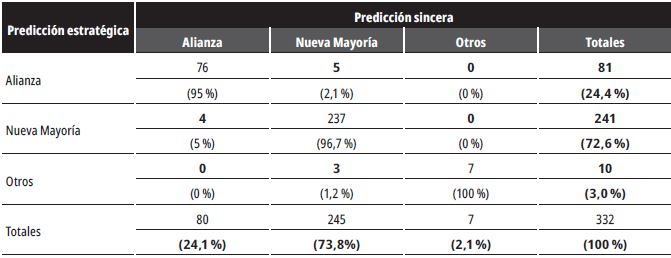 Las estimaciones de la votación estratégica son reportadas en la tabla 5. Las entradas a lo largo de la diagonal principal entregan el número y porcentaje de votantes en la muestra para quienes la estimación de votos sinceros y estratégicos es la misma. Los elementos fuera de la diagonal principal corresponden a los votantes estratégicos, es decir, aquellos que cambiaron su voto desde su primera preferencia, dadas las probabilidades objetivas de victoria de cada coalición en la circunscripción correspondiente.