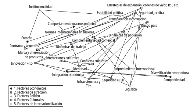 En consecuencia, las investigaciones que sugieren tratar integralmente el relacionamiento económico en los estudios de los negocios internacionales podrían vincular los factores que se describen en la figura 3, en gran parte, sustraídos de las agrupaciones temáticas que en esta revisión se han encontrado. El peso de cada factor depende de las intencionalidades y alcances de las apuestas investigativas y su aporte a la construcción de conocimiento en los negocios internacionales; a la vez, su tratamiento integral propone una potencial vinculación de la disciplina hacía otros campos de saber.
