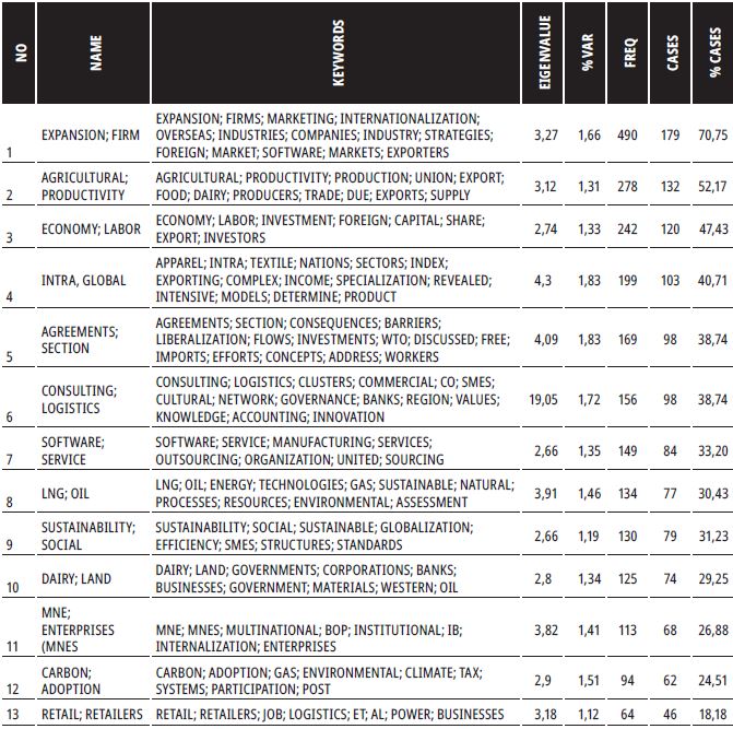 Se elaboró un análisis de contenido dirigido a identificar tendencias temáticas en el campo de investigación de los negocios internacionales. Para asegurar la confiabilidad del análisis de contenido, se combinaron técnicas manuales y asistidas por computador (minería de datos). En primer lugar, se analizaron las tendencias generales en el campo de la investigación en negocios internacionales; en particular, se delimitó a artículos científicos en la ventana de tiempo de observación. En segundo lugar, se conformó un listado de palabras clave a partir de un análisis de frecuencias (palabras repetidas) en los abstracts de los artículos escogidos. El análisis de frecuencias se realizó usando el software Wordstat 7.1 (Provalis Research, 2014). Las palabras con menos de 100 ocurrencias fueron descartadas del listado. Luego, se realizó una limpieza manual sobre la lista de palabras clave eliminando los términos conceptualmente irrelevantes; después, se hizo un análisis factorial exploratorio (método de rotación Varimax) sobre los datos de frecuencia de palabras para revelar la estructura temática latente de los abstracts. Las palabras con pesos primarios (eigen values) menores a 0,4 fueron excluidas del proceso de extracción. En tercer lugar, se revisaron de forma manual los abstracts clasificados en cada factor y se llevó a cabo una descripción cualitativa de su contenido, mediante el método de saturación, a partir de los clústeres señalados en la tabla 1. En consecuencia, se identificaron seis clústeres, el criterio de jerarquización se definió a partir de su peso (porcentaje de casos); además, al examinar factorialmente (eigenvalue), estos también tienen mayor cohesión entre sus descriptores (keywords). Es de resaltar que el método de selección de la muestra puede advertir una limitación en la investigación, al descartar artículos basados en otras categorías como impacto de los autores o de las publicaciones, incluso al obviar la selección de otras bases de datos, que contienen publicaciones relevantes en el campo.