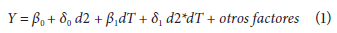 En la literatura académica existen diversas metodologías para evaluar el impacto de políticas; una de las más comunes es el método de diferencias en diferencias. De acuerdo con Wooldridge (2015), diferencias en diferencias es una técnica cuasiexperimental, que cuenta con un grupo control, que no se ve afectado por el cambio de política, y un grupo tratamiento, que sí se ve afectado por este cambio. Para calcular las diferencias sistemáticas entre estos dos grupos se necesitan datos para dos momentos: un periodo antes de la aplicación de la política y otro después de la aplicación. Por lo tanto, generalmente la muestra se descompone en dos grupos: el grupo control antes y después de la política, y el grupo tratamiento antes y después de la política. Sea dT una variable binaria que toma el valor de 1 para el grupo tratamiento y 0 para el grupo control; d2, otra variable binaria que toma el valor de 1 después del cambio de la política y 0 antes del cambio, y Y, la variable resultante que nos interesa, la ecuación de interés es: