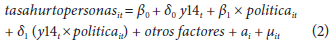 Donde, tasahurtopersonasit es la tasa de hurto a personas de la ciudad i durante el año t, y14t es una variable binaria que toma el valor de 1 después de 2014 y 0 antes de 2014; politicait es otra variable binaria que tomará el valor de uno si la ciudad i en el año t implementó alguna política para controlar el mototaxismo. (y 14tx political es nuestra variable de mayor interés, pues indica la efectividad de la política, ya que compara a las ciudades que implementaron alguna política después de 2014 con aquellas que no lo hicieron. Finalmente, ai es el efecto inobservable fijo de cada ciudad, que se elimina con la aplicación de los métodos de panel de datos.