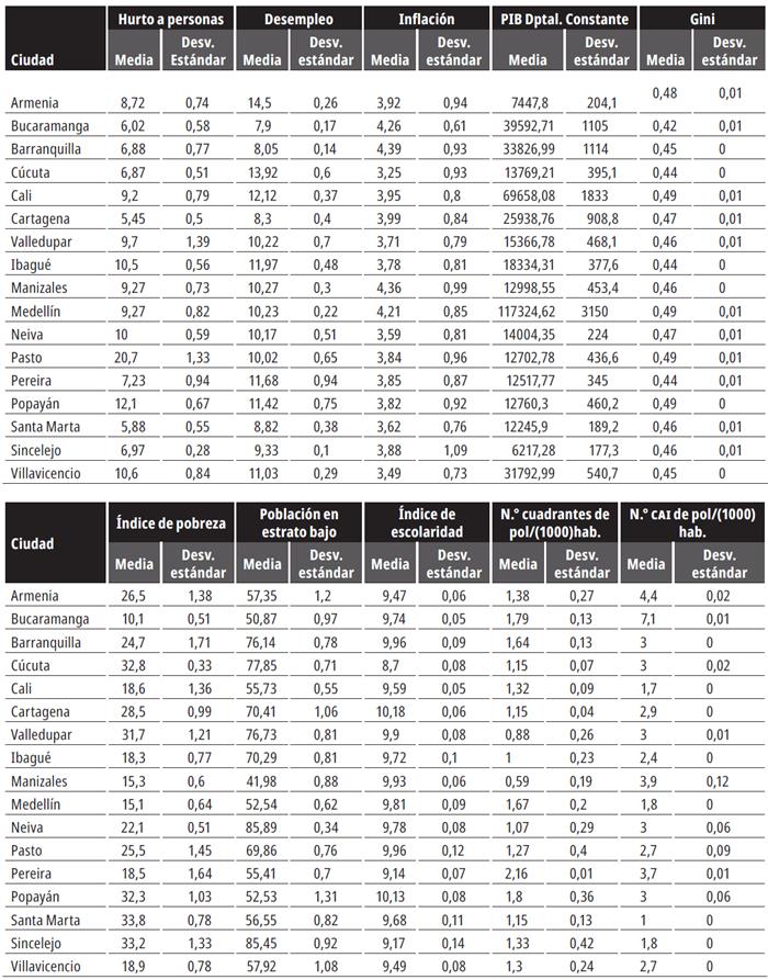 El anexo 1 muestra la media y la desviación estándar durante el periodo 2012-2017 para cada una de las ciudades estudiadas. Pasto registra la tasa más alta de hurto a personas: el 20,7 % de la población mayor de 15 años ha sido víctima de cualquiera de las modalidades de hurto a personas. Cartagena presenta la tasa más baja: 5,45 % durante el periodo 2012-2017. La tasa de desempleo promedio más alta se observa en Armenia (14,5 %) y la más baja se reporta en Bucaramanga (7,9 %). Manizales registra la tasa de inflación más alta durante 2012-2017 (4,6 %), mientras que en Cúcuta se reporta la tasa más baja (3,25 %). El departamento de Antioquía presenta el PIB más alto, con $117.325.000, y Sucre reporta el más bajo, con $6217 miles de millones). En cuanto a los indicadores sociales, Cali, Manizales, Pasto y Popayán registran el mismo coeficiente Gini (0,49), y son las ciudades con mayor desigualdad. Bucaramanga registra el nivel de desigualdad más bajo (0,42); Santa Marta registra las tasas más altas de pobreza: el 33,8 % de la población es pobre, mientras que en Bucaramanga el 10,1 %.