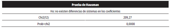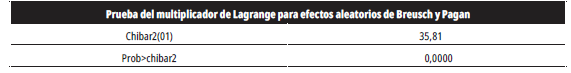 Para determinar si es necesario estimar el modelo de mínimos cuadrados ordinarios agrupados o efectos aleatorios, se realizó la prueba del multiplicador de Lagrange para efectos aleatorios de Breusch y Pagan. La hipótesis nula de esta prueba sostiene que la varianza del error es cero (σµ2=0). Los resultados permiten rechazar la hipótesis nula, por lo que es preferible estimar el modelo por efectos aleatorios (la estimación de la prueba se muestra en el anexo 2).