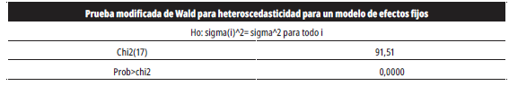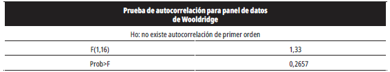Uno de los problemas comunes de los datos de panel es la violación del supuesto de autocorrelación o correlación serial, que ocurre cuando los errores de diferentes unidades están correlacionados o cuando los errores dentro de cada unidad se correlacionan en el tiempo. Para determinar si el modelo estimado presenta problemas de autocorrelación, se tuvo en cuenta la prueba de Autocorrelación para Panel de Datos de Wooldridge. Los resultados de la prueba (anexo 4) indican que no existe suficiente evidencia empírica para rechazar la hipótesis nula de no autocorrelación.; así, los modelos estimados por datos de panel no presentan problemas de autocorrelación.