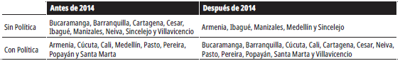 Con base en la metodología planteada, una parte importante de los resultados es determinar las características de la muestra. Se cuenta con información para seis periodos (2012-2017) de 17 ciudades capitales de Colombia, por lo que se dispone de una muestra total de 102 observaciones para los seis periodos. Del total de ciudades, ocho ya habían aplicado alguna política para controlar el mototaxismo antes de 2014, año que se tomó como corte para evaluar la efectividad de dichas políticas. Después del 2014, cuatro ciudades más implementaron alguna política, para un total de 12 ciudades. Con respecto a las ciudades que no implementaron ninguna política, antes de 2014 eran nueves las que no se habían pronunciado al respecto, pero después de 2014 el número de ciudades se redujo a cinco.