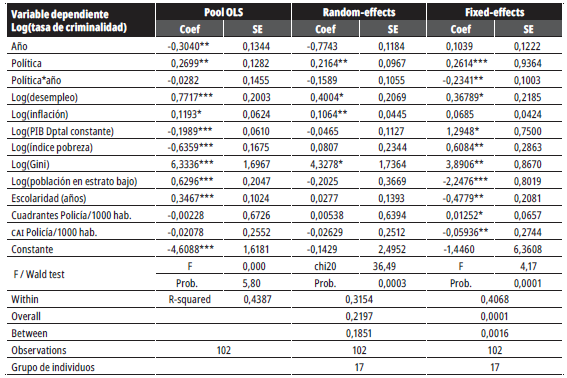 Finalmente, en cuanto a la bondad de ajuste, los tres modelos estimados son globalmente significativos (prueba F y chi2). Respecto al modelo de efectos fijos, toda la variación de las variables explicativas se origina dentro de cada grupo, en este caso, cada ciudad; de esta forma, la diversidad del conjunto de variables independientes dentro de cada ciudad a través del tiempo explica el 40,68 % de la variación de la tasa de hurto a personas.