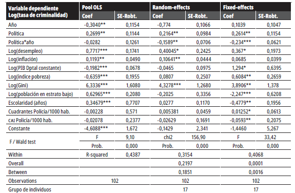 La metodología más simple para la estimación de un modelo de panel de datos supone omitir las dimensiones del tiempo y el espacio, y estimar un modelo de regresión por mínimos cuadrados ordinarios (MCO) agrupados (Pool OLS). Los resultados de las estimaciones se muestran en el primer recuadro de la tabla 2. Sin embargo, el modelo por MCO, parte del supuesto de que el intercepto de la regresión es igual para todos los individuos, en este caso, ciudades. Sin embargo, es importante que se pueda controlar el carácter individual de cada ciudad, para lo cual se consideró el modelo de efectos aleatorios, que supone que cada ciudad tiene un intercepto diferente. Las estimaciones del modelo de efectos aleatorios se muestran en el segundo recuadro de la tabla 2.