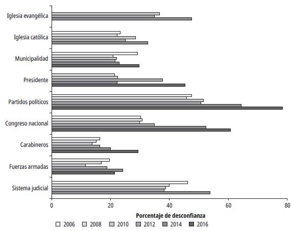 En efecto, de acuerdo con la medición de 2016, un 78,9 % y un 61 % de la población desconfía de los partidos políticos y del Congreso Nacional, respectivamente; cifras que representan un incremento superior al 60 % respecto de lo que se reportó para 2006. Adicionalmente, el sistema judicial y la iglesia evangélica son instituciones cuyos niveles de desconfianza bordean el 50 % en la medición de 2014, la que no superaba el 40 % en 2010. Por el contrario, las Fuerzas Armadas, los Carabineros de Chile y el Gobierno local (i. e., municipios) son instituciones que registran los menores índices durante el periodo 2006-2016, a pesar de la creciente tendencia de desconfianza en Chile.