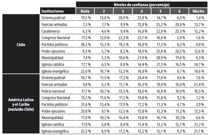 De acuerdo con la tabla 1, Chile muestra niveles más altos de confianza en las Fuerzas Armadas, Carabineros de Chile y el Ejecutivo, y un mayor porcentaje de respuestas en niveles bajos de confianza en los partidos políticos, la iglesia evangélica y el sistema judicial. En términos comparativos, las cifras sugieren que la población chilena confía más en la policía nacional, el poder ejecutivo y el Gobierno local en relación con sus pares de América Latina y el Caribe. Además, tal comparación indica que la desconfianza hacia el sistema judicial y la iglesia evangélica (o protestante) es mayor entre los chilenos.