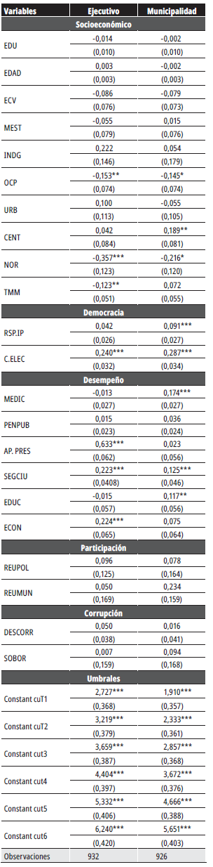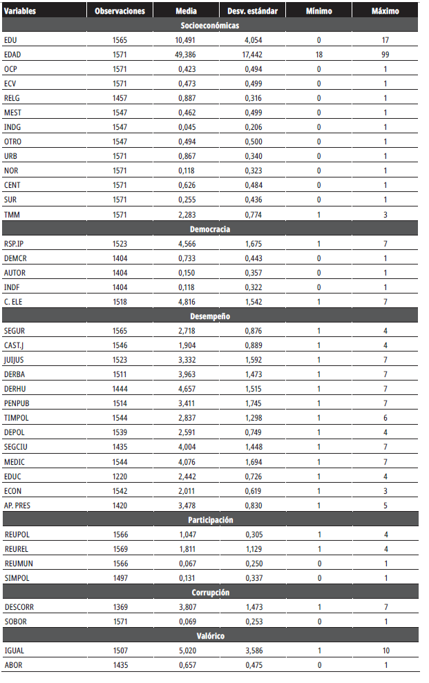 Siguiendo la revisión de la literatura para explicar la confianza institucional, se incluyen variables explicativas que capturan diferencias socioeconómicas entre los encuestados, de percepción sobre la democracia, el desempeño institucional, la participación de la sociedad civil y la corrupción. En primer lugar, se incorporan una serie de características socioeconómicas y de localización de los encuestados. De esta manera, se considera EDU el nivel de educación medido en años de estudio; EDAD los años de vida del encuestado; OCP una variable dicotómica que toma el valor de 1 si la persona se encuentra ocupada y 0 en otro caso; ECV el estado civil de la persona tomando el valor de 1 si es casado y 0 otros caso; MEST e INDG son definidas como variables dummies identificando la etnia del encuestado como mestizo o indígena, respectivamente, tomando el valor de 1 si pertenece a alguna de las etnias anteriores y 0 en otro caso; RELG hace referencia a si la persona es miembro de una organización religiosa, tomando el valor de 1 si es miembro y 0 en caso contrario; URB es una variable dummy que toma el valor de 1 si la persona vive en una zona urbana y 0 en una zona rural; NOR y CENT son variables dummies por zona, y queda como base la zona sur; TMM es una variable que mide el tamaño de un municipio siguiendo tres categorías: municipios grandes que contienen más de 100.000 habitantes (3), medianos que tienen 25.000 y 100.000 habitantes (2) y pequeños con menos de 25.000 habitantes (1).