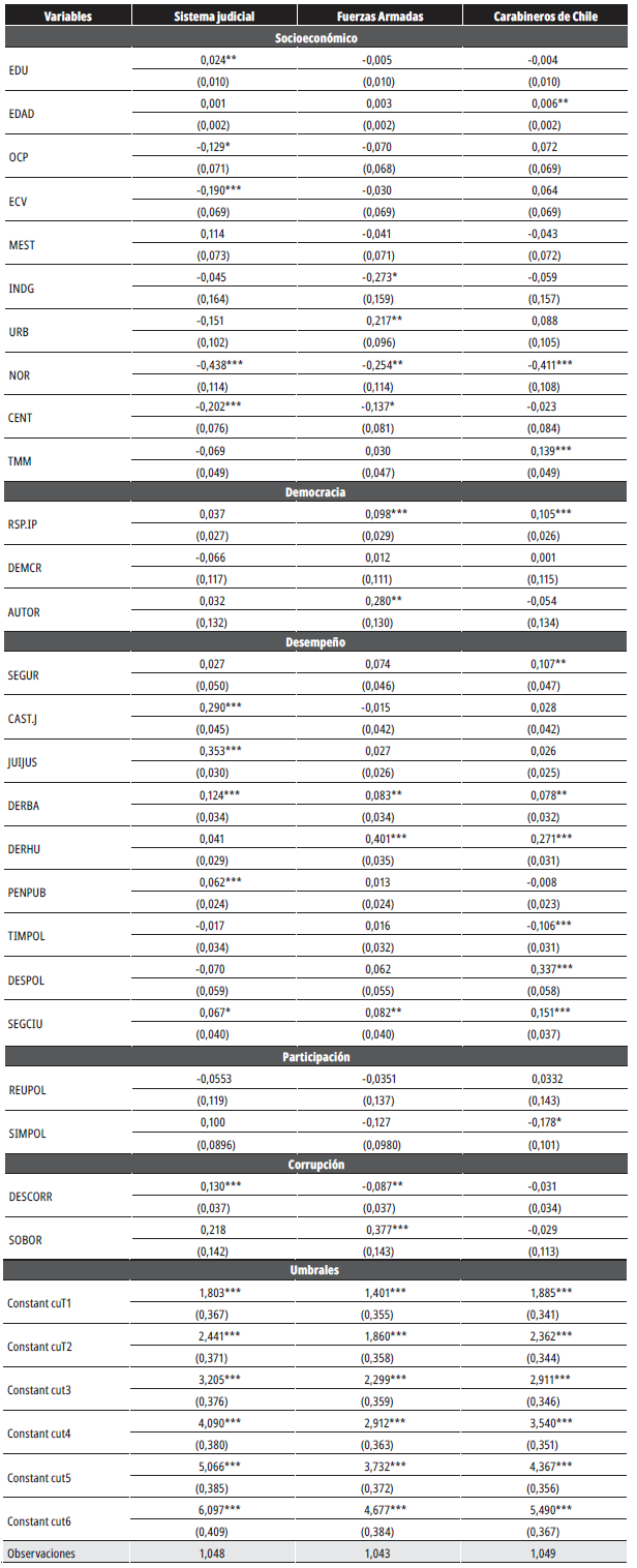 En esta sección se discuten los resultados de las estimaciones para cada grupo de instituciones. La tabla 3 muestra los parámetros estimados para los modelos y explica la confianza en instituciones judiciales y de seguridad, particularmente en el sistema judicial, las Fuerzas Armadas y los Carabineros de Chile.