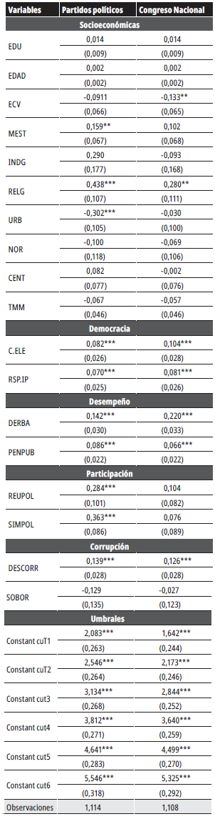 La tabla 4 presenta los parámetros estimados para el modelo y explica la confianza institucional en los partidos políticos y en el Congreso Nacional.