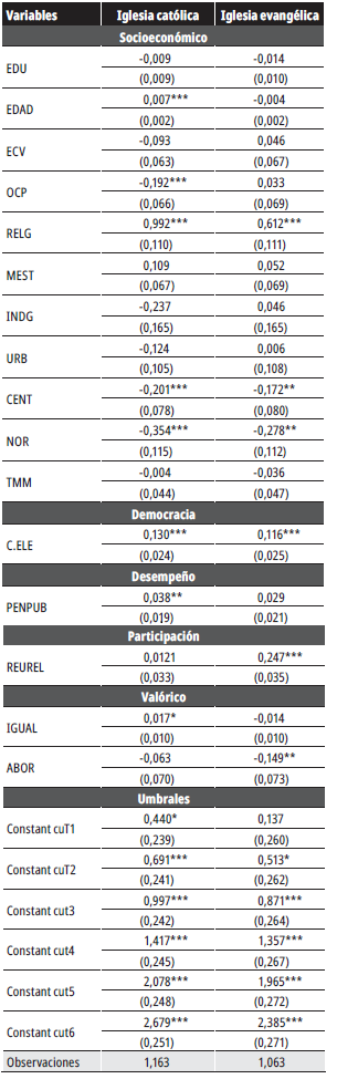 La tabla 6 presenta los resultados para la confianza en instituciones religiosas.