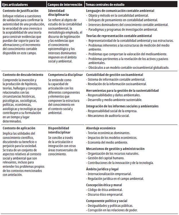 Leff (2002) señala que es necesario romper las fronteras de los dominios conceptuales y materiales de las disciplinas, derrotando las estrategias del poder implícito en el pensamiento y en la complejidad de los métodos, abriéndose a otras racionalidades, no disciplinarias, en la dirección del diseño y de la conducción de un programa interdisciplinario, cuya enseñanza sea algo más que la simple conjugación de asignaturas en el plan de estudios. Para eso, es importante desarrollar un programa multitemático en el campo socioambiental, donde se construirán nuevos saberes, técnicas y conocimientos (inscritos en un contexto de creación científica), que serían incorporados como contenidos integrados en el proceso de formación del alumnado. Eso requiere la construcción de nuevos objetos interdisciplinares de estudio, a través de la problematización de los paradigmas imperantes, de la formación de los docentes y de la incorporación del saber ambiental emergente en nuevos programas curriculares de la enseñanza universitaria en contabilidad (Leff, 2008).