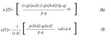 Por su parte, L sabe que hay dos posibles niveles de beneficios observados, uno alto (IIa) y otro bajo (IIb<IIa), determinados por la conducta de A. La probabilidad de alcanzar un beneficio alto (IIa) es p, mientras que de uno bajo (IIb) es q, de modo que, 0 < q < p < 1.
