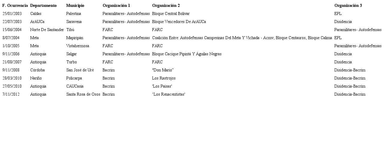 Muchas de las alianzas celebradas que se presentan en la Figura 4 se han fracturado y colisionado entre sí, desembocando en olas de violencia con afectación a terceros. El informe general del Centro de Memoria Histórica -cmh (2013) habla de unos 23.161 homicidios selectivos entre 1981 y 2012 provocados por la interacción entre estos grupos.
