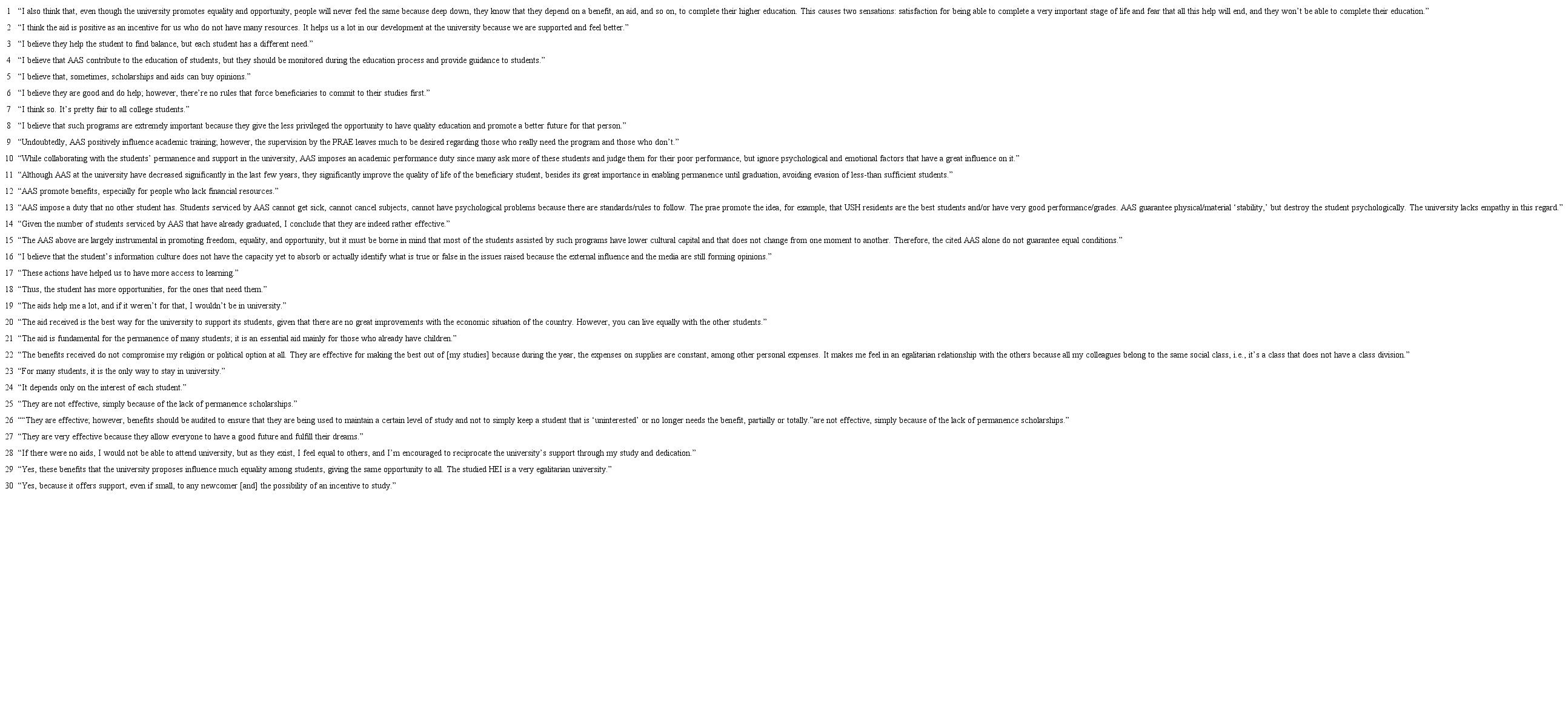 Some quotes are specific, indicating that, for its respondents, it was only feasible to attend the university because of AA aids and benefits. It is suggested that such statements confirm the theory of justice by proposing that “a sense of justice leads us to promote just systems and to play our part in them when we believe others, or at least a sufficient number of them, will play theirs” (Rawls, 2000, p. 295). It is stated that AAS answer the questions of justice because the student, when he feels welcomed and is sure to have his primary needs met, does his part with good performance and permanence in higher education. However, as described by student 1 in Table 10, “although the university promotes equality and opportunity, people do not feel equal.” This statement is consistent with what is emphasized by Silva (2019) that students rarely enjoy the same level of adjustment to the academic environment.