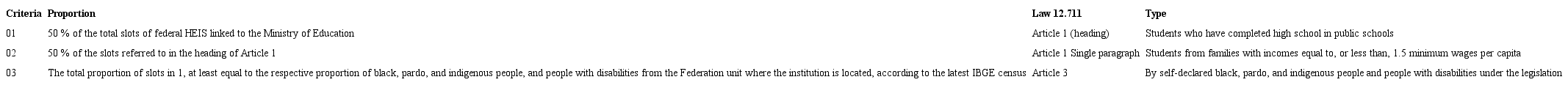 The consolidation of AA programs concerning undergraduate studies would only occur on August 29, 2012, through Law 12.711/2012. According to Dias and Bax (2016), Quota Act and legalizes the allocation of 50 % of slots in federal HEIS linked to the Ministry of Education, as described in Table 1.