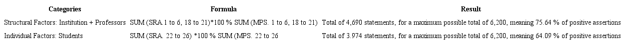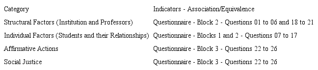 Table 2 identifies the questions that correspond to each factor; that is, when analyzing the content of Questions 01 to 06 and 18 to 21, we obtained inputs to evaluate the factors related to the institution that the respondents attend and their professors. Questions 07 to 17 are related to students themselves and their relationships. The analysis of students' perceptions regarding the effectiveness of AAS in promoting social justice was based on Questions 22 to 26.