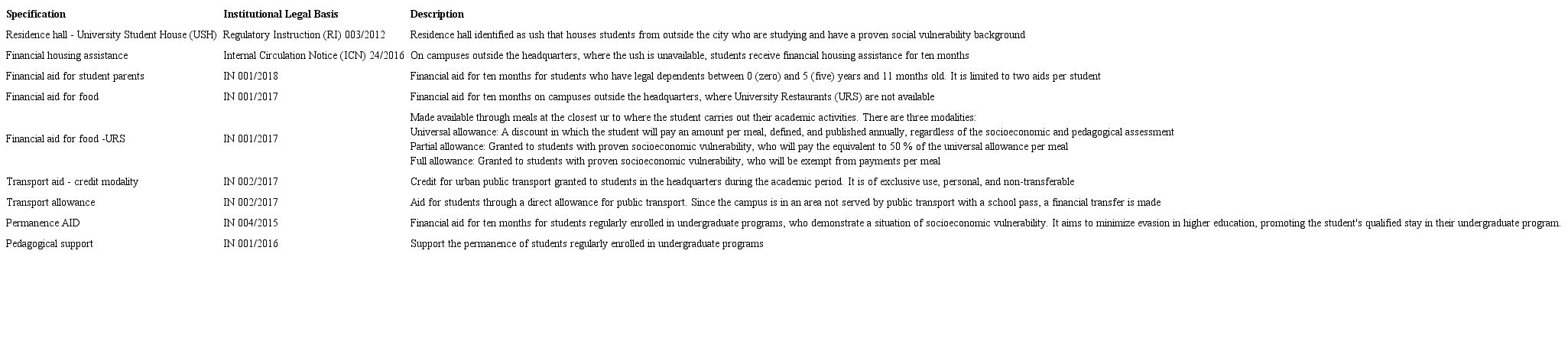 According to the nsap, student assistance actions should be coordinated with teaching, research, and extension activities to meet the needs of students regularly enrolled in classroom undergraduate programs. These activities will enable equal opportunities for improving academic performance and prevent situations of evasion due to insufficient financial conditions. The priority of the program is to assist students from the public education system or with per capita family income up to one and a half minimum wages, without prejudice to other requirements set by the institution (Brazil, 2010).